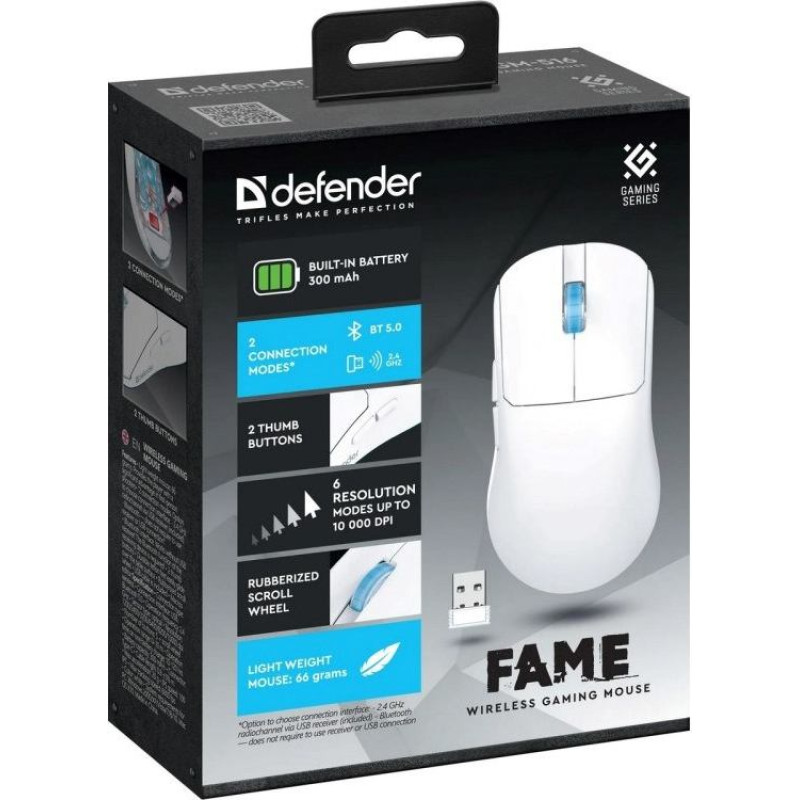 Defender WIRELESS MOUSE DEFENDER FAME GM-516 RF+BT 10000DPI 6P WHITE