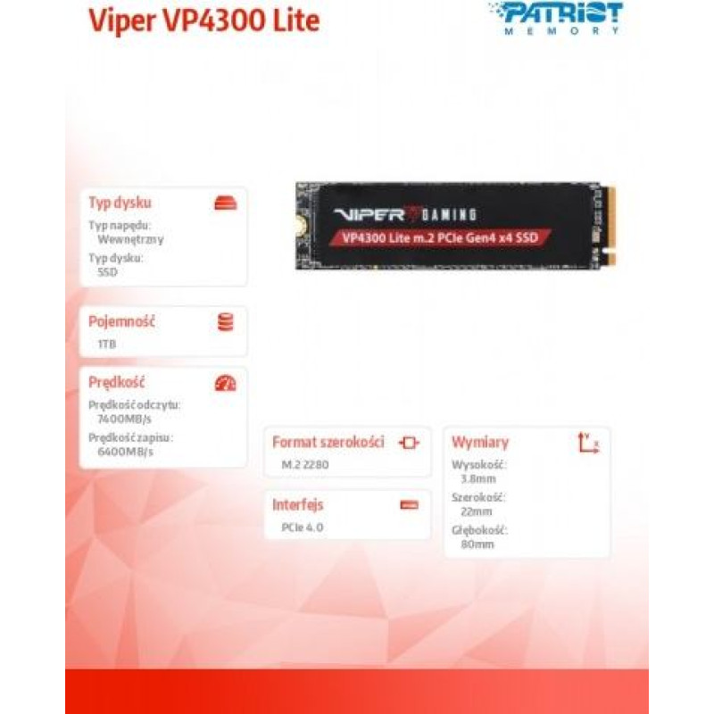 Patriot SSD drive 1TB Viper VP4300 Lite 7400/6400 M.2 PCIe Gen4x4 NVMe 2.0 PS5